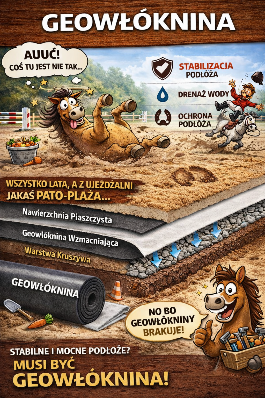 Geowłóknina na ujeżdżalnie, wykonana z włókien Polipropylenowych zapewniająca długotrwałą żywotność i niską podatność na uszkodzenia.